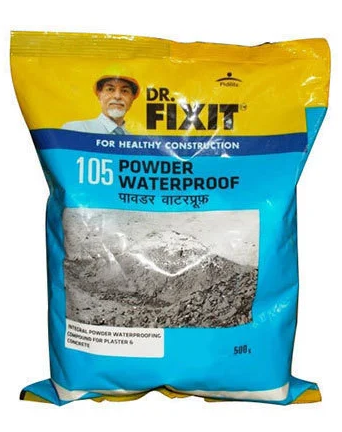 Dr. Fixit powder waterproof is composed of waterproofing additives dispersed in inert fine filler. It is an integral powder-waterproofing admixture used for the waterproofing of concrete and cement plasters because it makes concrete cohesive, reduces porosity, and improves water tightness.